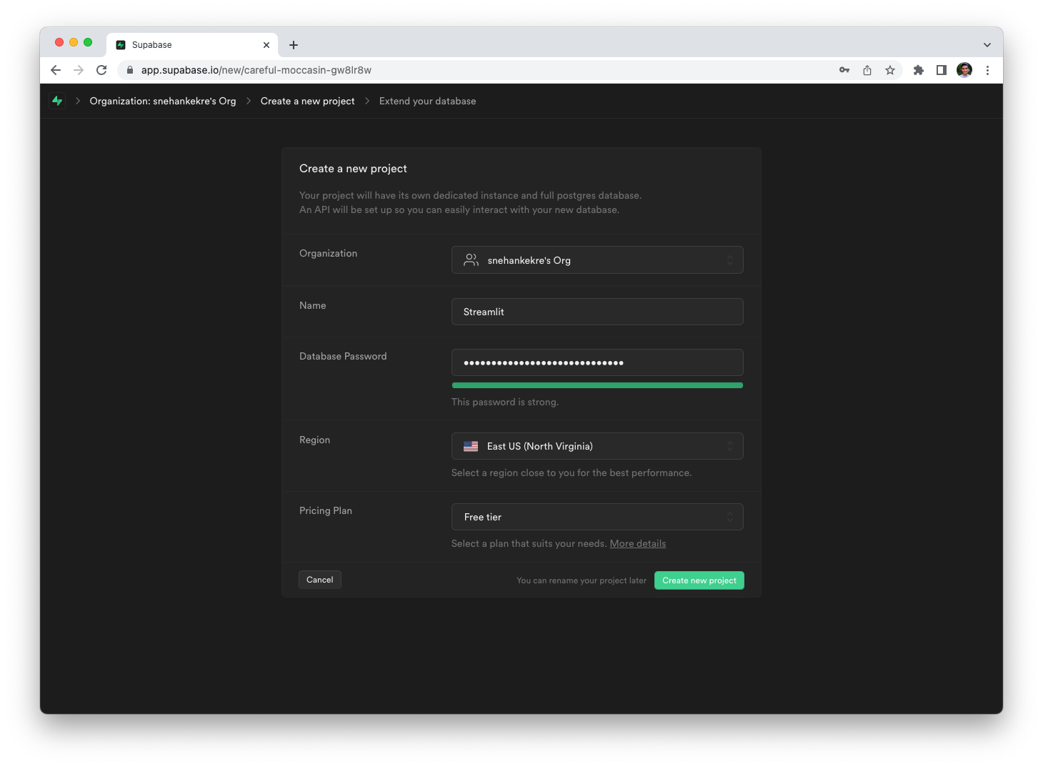 Create a Supabase database